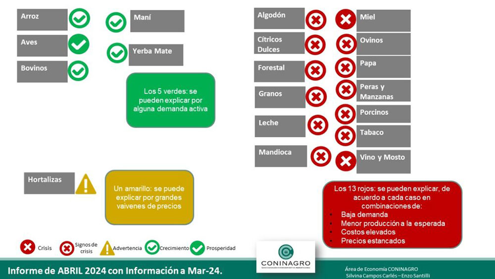 Según Coninagro, los números de marzo (que componen este semáforo de abril), muestran que las producciones agro tienen precios por debajo de la inflación y costos altos. Si bien hubo precios que sufrieron saltos de entre 12 a 29% en marzo, si se analiza en forma interanual todavía no se observa un cambio de tendencia significativo. Para el mes siguiente se espera que ésta empeore un poco más.