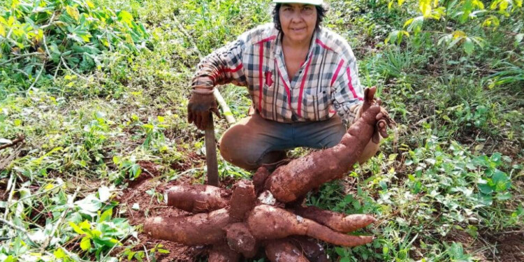 “La mandioca da en cualquier lugar, salvo que el suelo sea encharcado”, manifestó la productora, y a modo de ejemplo del buen resultado de sus prácticas, reveló: “Acá tengo cuatro variedades: petriski negra, la petriski rosada, la papa negra y una mandioca blanca. Estoy sacando plantas de 8 meses, mandioca nueva, que tienen raíces de un kilo. Son plantas de 7 kilos, cuando la producción promedio es de 4 kilos por planta. Incluso sacamos una planta de un año y medio con 27 kilos”.