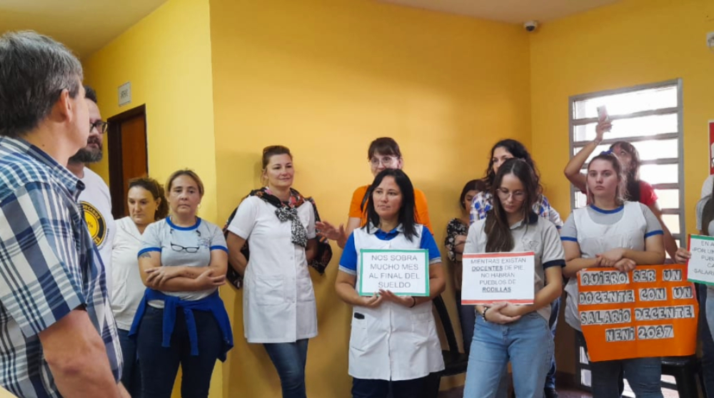 En Oberá, mientras la presidente del Consejo General de Educación, Daniela López y el ministro de Educación provincial, Ramiro Aranda, realizaban la despedida a una docente que se jubilada, fueron “arrinconados” por docentes, quienes les pidieron la apertura del diálogo y respuestas a los reclamos por un salario digno. Los funcionarios se retiraron del lugar en silencio.