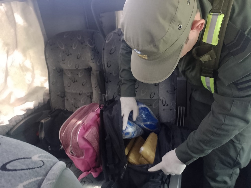 Allí vieron tres mochilas en los últimos asientos de pasajeros que pertenecía a dos mujeres. Notaron un peso excesivo en los equipajes, que en su interior tenían 25 paquetes rectangulares con una sustancia vegetal, muy similar a la cannabis sativa.