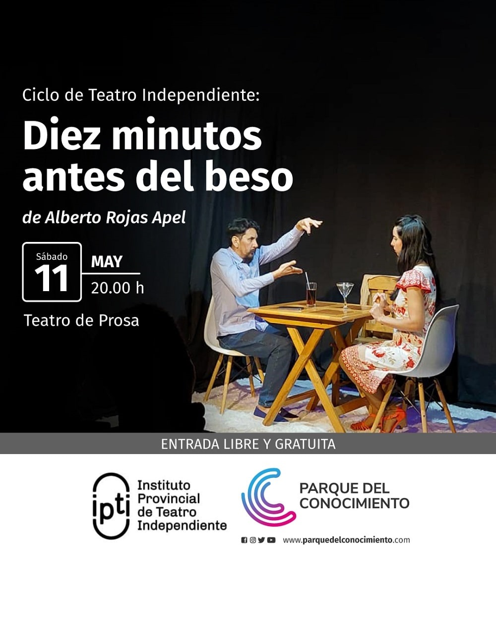 Una comedia teatral de Alberto Rojas Apel, que relata la historia de Beto y Maricel quienes se encuentran por tercera vez en un bar. Ambos quieren besarse, pero no saben cómo. El conflicto es sencillo pero contundente: en 10 minutos cierran el bar y ese es el límite para decir lo que sienten. Recomendada para adolescentes y adultos. La entrada será libre y gratuita por orden de llegada hasta agotar la capacidad de la sala.
