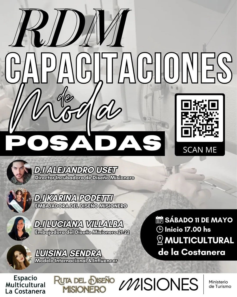 Con el objetivo de impulsar y profesionalizar la industria de la de la moda de la provincia de Misiones, este sábado 11 a partir de las 17 horas, la Ruta del Diseño Misionero y el Espacio Multicultural de la Costanera de Posadas brindarán una serie de capacitaciones en cuatro áreas fundamentales: Fashion Software, Fashion Business, Diseño & Creatividad, Modeling & Lifestyle.