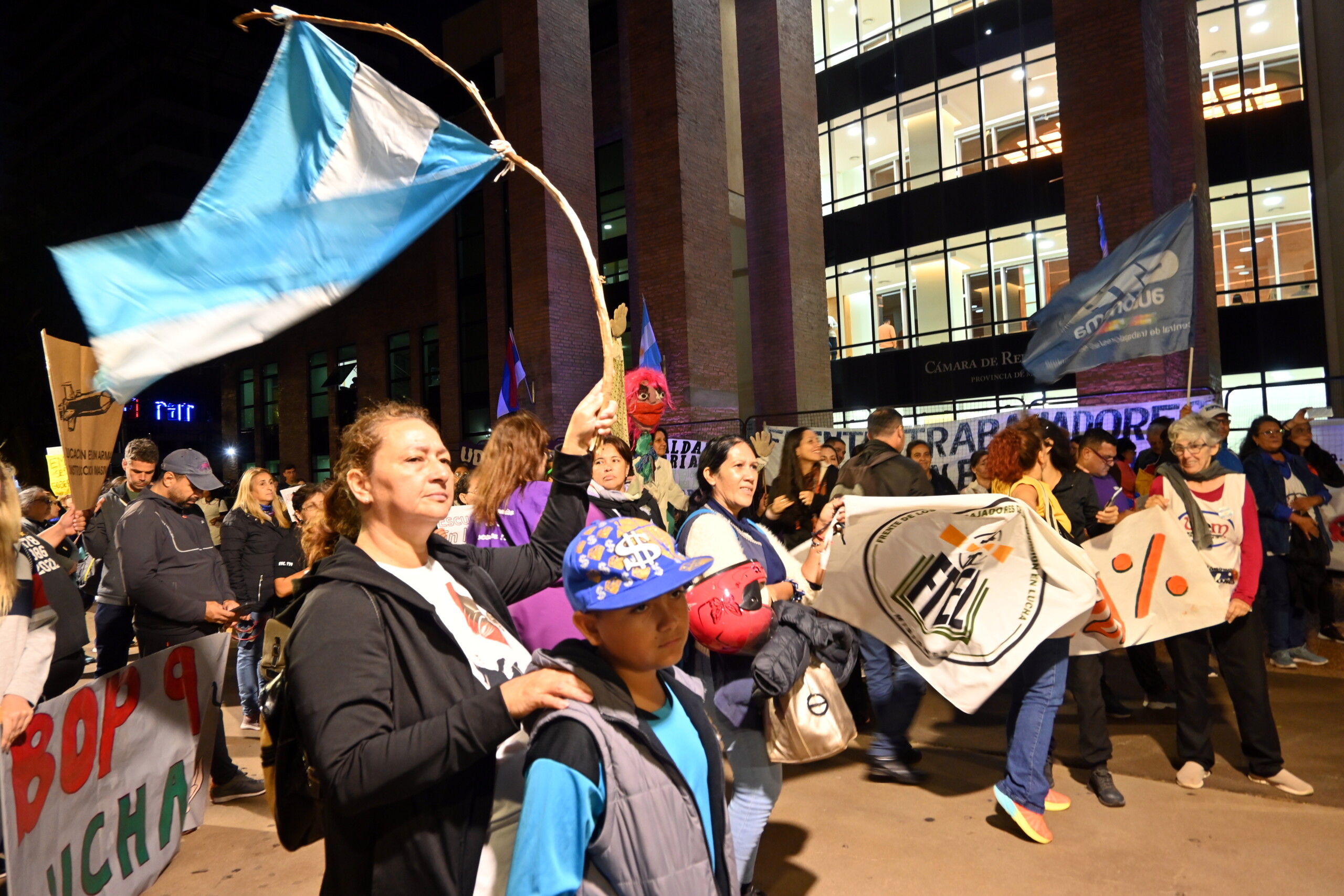 La concentración tuvo lugar en la Plaza 9 de Julio, desde donde emprendieron rumbo a la Legislatura, minutos antes de las 18, encolumnados en una extensa fila que llegó a ocupar dos cuadras, todo acompañado de pancartas, cánticos y banderas.