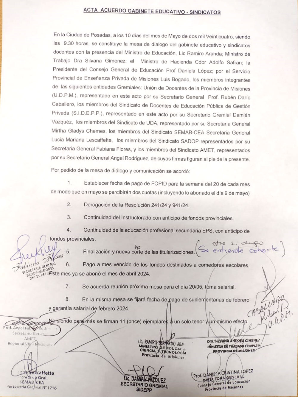 Los funcionarios del Gobierno -los ministros de Educación Ramiro Aranda y de Hacienda Adolfo Safrán, y la presidente del Consejo General de Educación Daniela López- se comprometieron además a pagar el FOPID el 20 de cada mes.