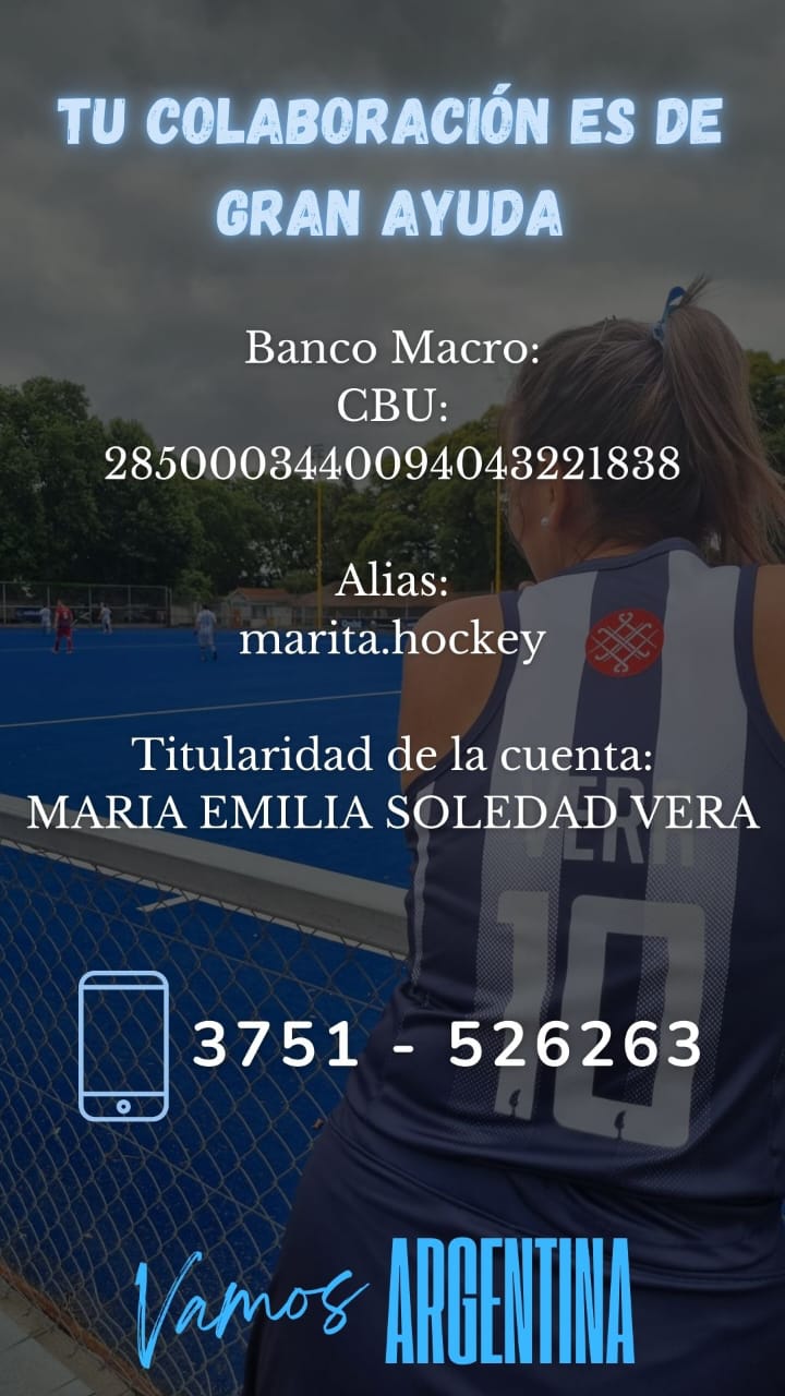 Es por ello que solicita ayuda a través de una “cruzada solidaria” para juntar fondos para poder ser parte de la Selección Argentina de Hockey. Los interesados podrán contactarse con la deportista a través del número 3751-526263 o en las redes sociales de Marita vera en Facebook o Marita.vera en Instagram. También por el CBU 2850003440094043221838 del Banco Macro. Alias: marita.hockey