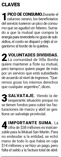 “Para no seguir haciendo crecer la deuda nos recomendaron que cedamos la parte de servicio eléctrico. Las voluntades están divididas, porque claramente no quieren pagar una boleta altísima, pero tampoco se quieren ir de la mutual. Pero bueno, acá se depende de lo que la mayoría vota, y si la mayoría se quiere ir, se van todos”, acotó el vecino de Villa Bonita.