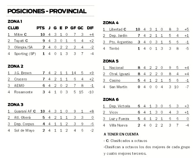 Por su parte, en la Zona 5 se dará un partidazo entre Nacional y Central Iguazú, que será un mano a mano por el boleto a octavos. El que gane avanzará, pero un empate será más beneficioso para ambos ya que los dos tendrán su boleto. El otro choque será entre Casino, que sigue de cerca la lucha, y San Martín, que prácticamente no tiene chances.