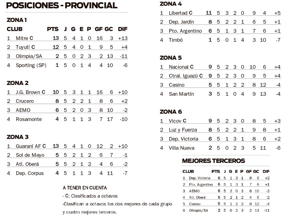 A su vez, en la Zona 4, Deportivo Jardín América dejó pasar la chance de lograr el boleto anticipado, pues igualó 1-1 con Libertad de El Soberbio, que ya tiene su lugar asegurado. En la pelea también se metió Puerto Argentino de San Pedro, que se impuso por 2-0 a Timbó de Jardín América que, con este marcador, se despidió de la competencia.
