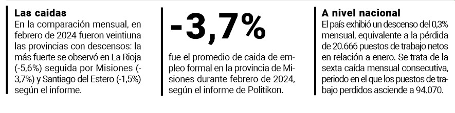 En Misiones, fue aun más profundo el resultado negativo, al quedar la jurisdicción como la segunda que más perdió empleo formal en el segundo mes del año, comparado con enero. Solo le fue peor a la provincia de La Rioja, donde se cayó el 5,6% de los puestos de trabajo registrados.