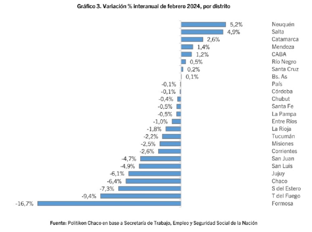 Por el contrario, son dieciséis las provincias con caídas interanuales, donde se destacan las de Formosa (-16,7%), Tierra del Fuego (-9,4%) y Santiago del Estero (-7,3%) como las más fuertes”.