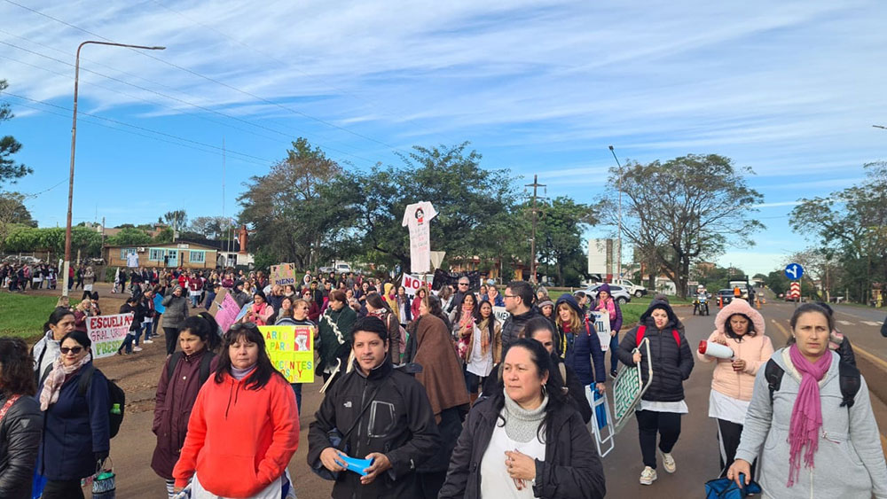 En Guaraní, departamento de Oberá, otro grupo de educadores se concentró en el acceso a la localidad y se desplazaron caminando por Av. Remedios de Escalada hasta Plaza San Martín.