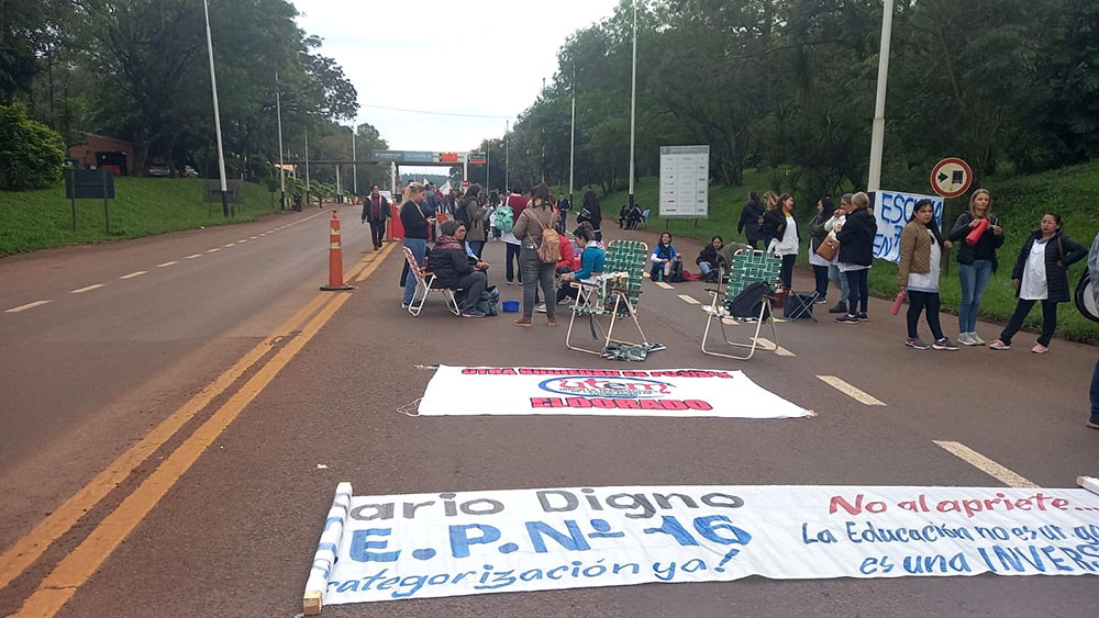 En Cerro Azul los educadores ya comenzaron con el corte de la ruta 14. También en la ruta 14, pero en Aristóbulo del Valle, los docentes cortan la ruta, pero solamente media calzada.