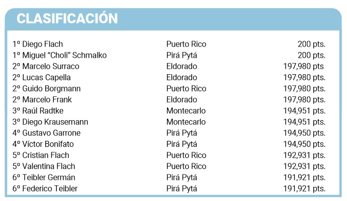 Los actuales campeones, los montecarlenses Raúl Radtke y Diego Krausemann deberán hilvanar al menos dos victorias y especular con algún tropiezo de los líderes para volver a tener chances de retener el título logrado el año pasado en la última fecha.