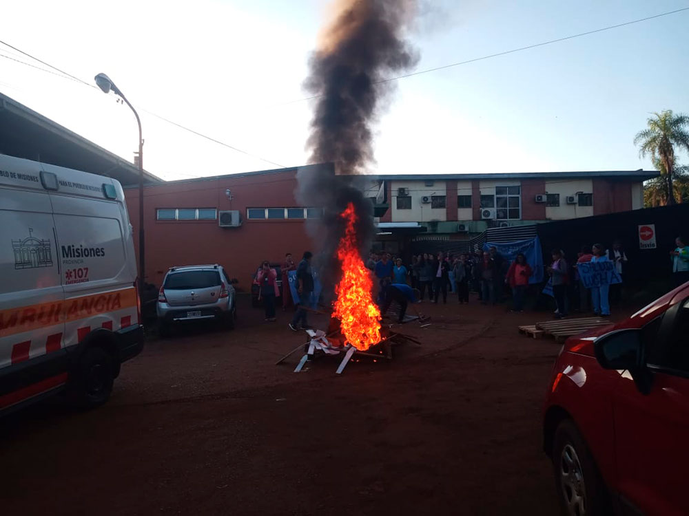 Esta mañana alrededor de 40 trabajadores de Salud Pública del Hospital SAMIC (Kilómetro 10), del Hospital Ramón Gardes (Kilómetro 3) y de algunos CAPS se concentraron en el sector de emergencias del SAMIC e iniciaron una quema de neumáticos.