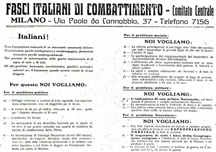 El 23 de mayo de 1919 aparecía por primera vez en el campo político la palabra “fascismo”. Expulsado del Partido Socialista, Benito Mussolini anunciaba en el diario Popolo d’Italia la creación de los “fasci italiani di combatimento”.