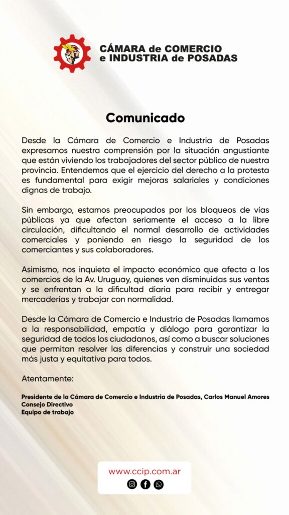 Desde la Cámara de Comercio e Industria de Posadas (CCIP) emitieron este miércoles un comunicado a través del que expresaron su preocupación por los efectos nocivos que está causando sobre la actividad del sector la prolongada protesta de policías, penitenciarios, docentes y otros sectores que desde hace seis días se mantienen apostados sobre la avenida Uruguay frente al Comando Radioeléctrico.