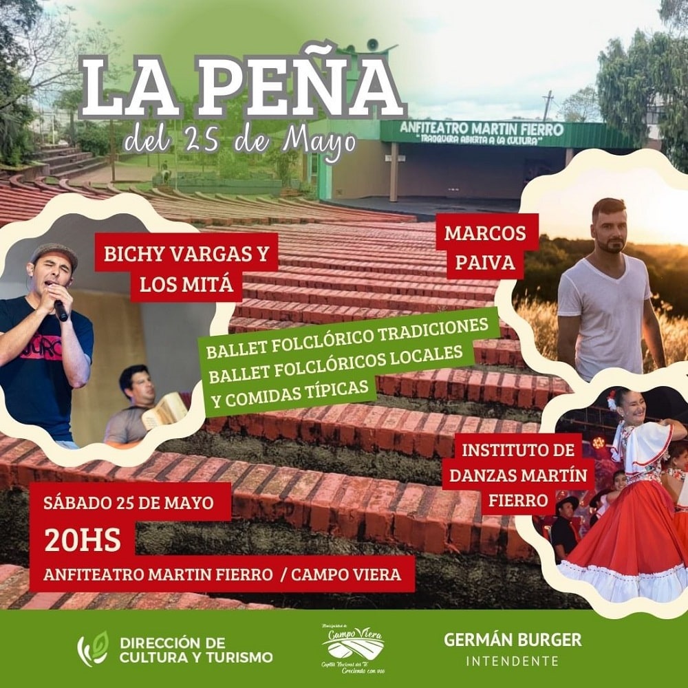 Organizada por la municipalidad de Campo Viera, este sábado a partir de las 20 horas se realizará una gran Peña Patria en el Anfiteatro Martín Fierro. Actuarán: Bichy Vargas y Los Mitá, Marcos Paiva y el Ballet folklórico Tradiciones, entre otros. Entrada libre y gratuita