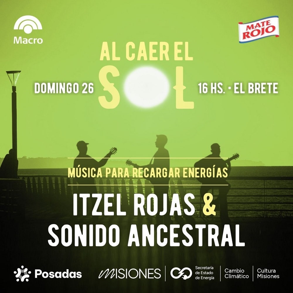 Este domingo 26 a partir de las 16 horas, llega el Festival Al Caer el Sol en el balneario El Brete de Posadas. En esta oportunidad subirán al escenario Itzel Rojas y Sonido Ancestral. Entrada libre y gratuita.