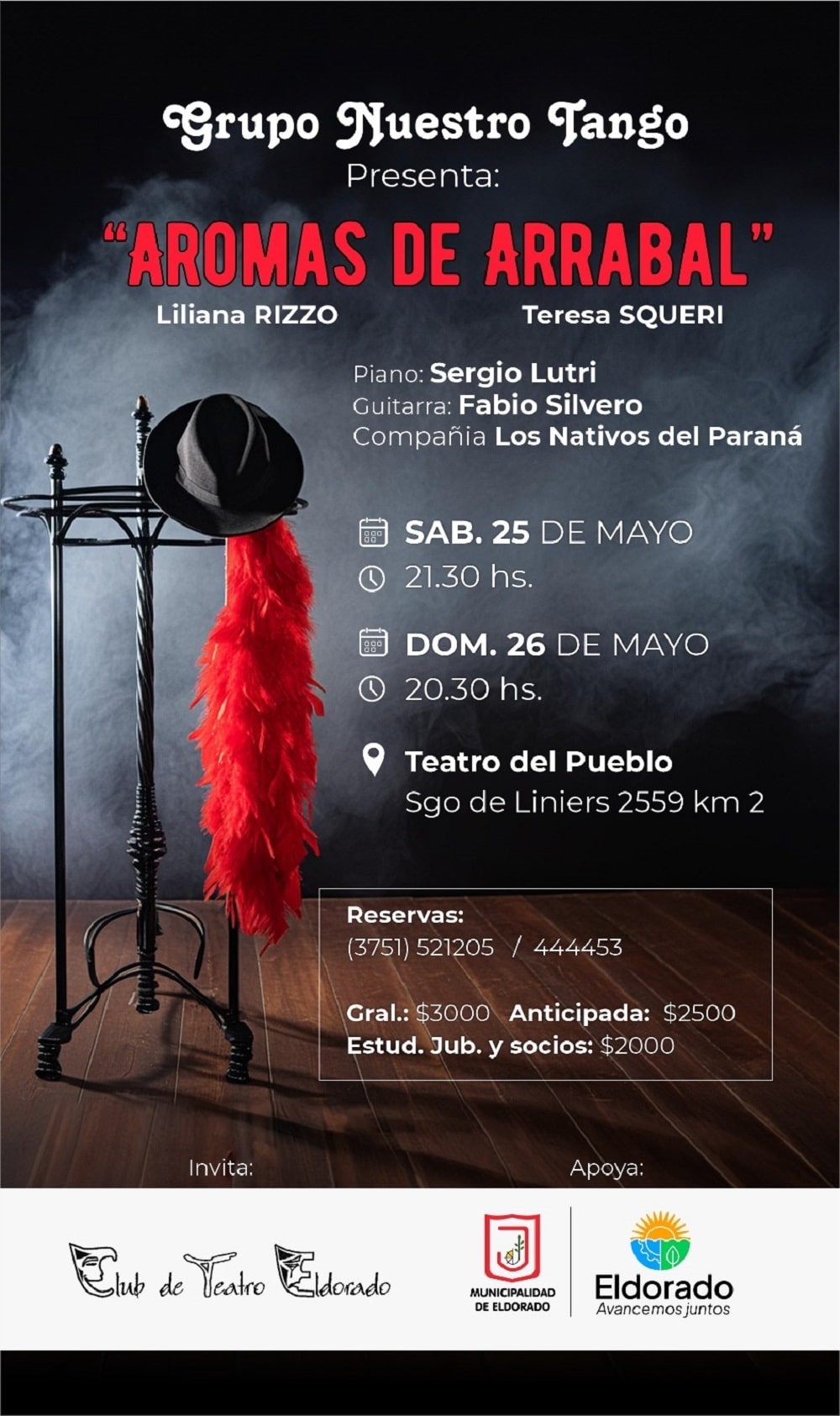 Durante el fin de semana se presentará el imperdible Show de “Tango Aromas del Arrabal” en el Teatro del Pueblo (Santiago de Liniers 2559 Km2). Funciones: sábado 25 a las 21.30 y domingo 26 a las 20.30. Anticipadas $2.500, en puerta General $3.000, jubilados y socios $2.000. Reservas al 3751521205 – 444453.