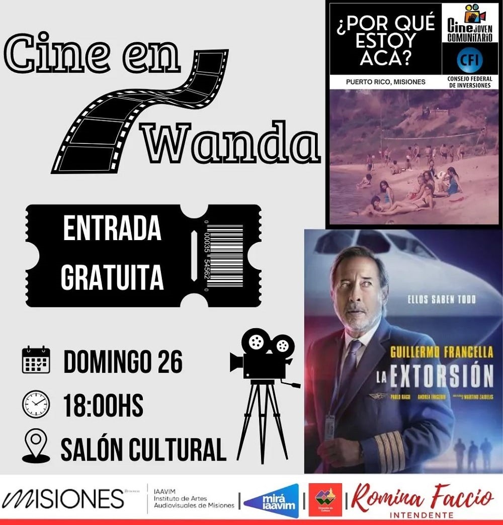 Organizado por la dirección de Cultura de la municipalidad de Wanda, este domingo 26 a las 18 horas, se compartirá una tarde de cine con la proyección del cortometraje ¿Por qué estoy acá?, del Cine joven Comunitario de Puerto Rico, y la película argentina La extorsión, protagonizada por Guillermo Francella en el Centro Cultural de Wanda. Entrada libre y gratuita.
