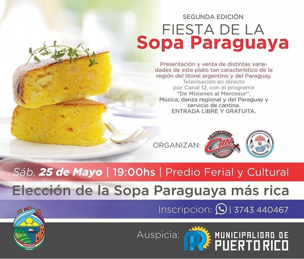 Este sábado, a las 20, en el marco de las celebraciones patrias, De Misiones al Mercosur, que se trasmite por la señal de Canal 12, compartirá su espacio con la segunda edición de la Fiesta de la Sopa Paraguaya en el predio Ferial de Puerto Rico. Entrada libre y gratuita.