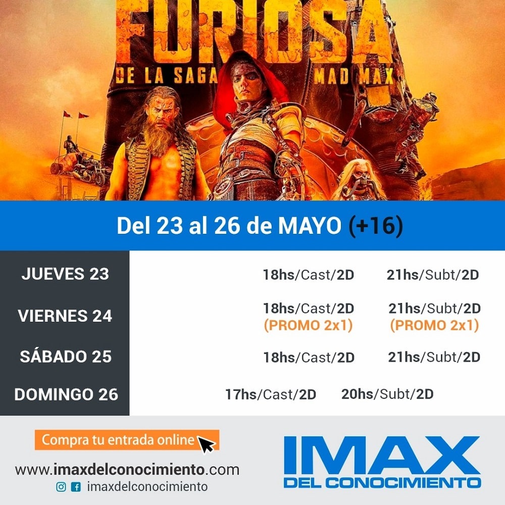 Del jueves al domingo 25 Unite a la batalla más intensa. Furiosa: de la Saga Mad Max de estrena en la pantalla del IMAX del Conocimiento.