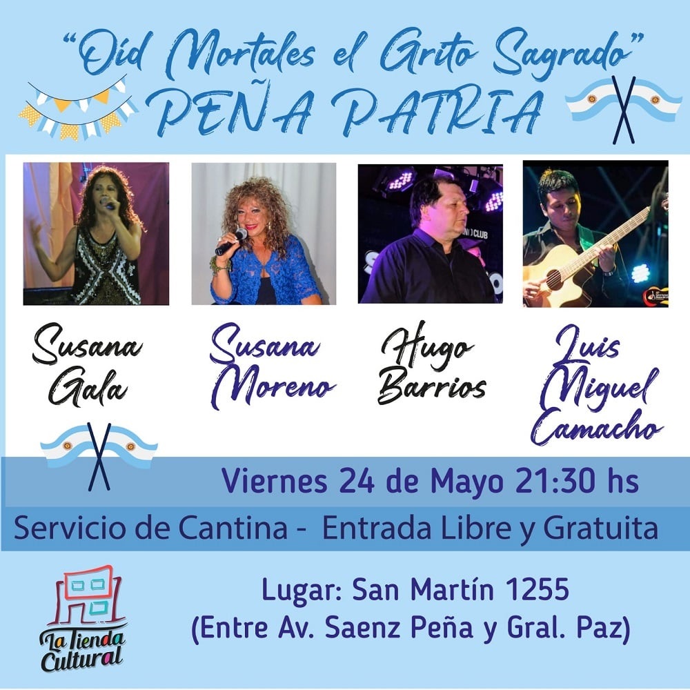 Con una Velada Patria, La Tienda Cultural (San Martín 1255) de Posadas, inicia su ciclo de Peñas, este viernes 24 a las 21,30 con la música y artistas locales. En esta oportunidad actuarán: Susana Gala, Susana Moreno, Hugo Barrios y Luis Miguel Camacho serán parte de la celebración. Entrada libre con servicio de cantina.