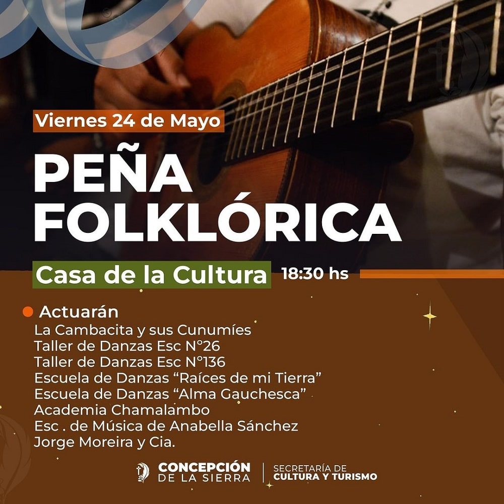 En la víspera del Cumpleaños de la Patria, este viernes 24 a partir de las 18.30 horas Concepción de la Sierra vivirá una peña folklórica en la Casa de la Cultura de la localidad. Entrada libre y gratuita.