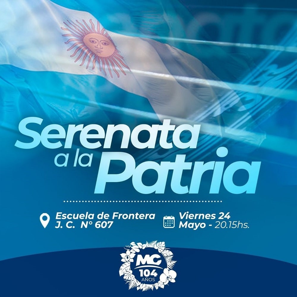 Este viernes 24, a las 20.15, organizado por la Escuela de Frontera J.C. N°607 y con el apoyo del municipio, Montecarlo vivirá una Serenata a la Patria con la participación de distintas escuelas de danza y grupos musicales como los Hermanos Scherer. Entrada libre y gratuita con servicio de cantina y buffet.