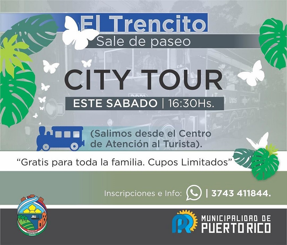 En el Día de la Patria, la municipalidad de Puerto Rico invita a un City tour gratuito, a bordo de ‘El Trencito’,este sábado 25 a las 16.30 horas, en el Centro de Atención al Turista. Reservas: Sin costo al 3743 411844. Cupos limitados.