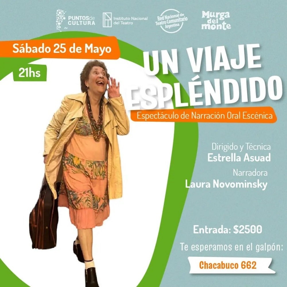 Este sábado 25 a las 21 llega el espectáculo de narración oral escénico “Un Viaje Espléndido”, Laura Novominsky en el Galpón de la Murga del Monte (Chacabuco 662) de Oberá. Entradas $2.500.
