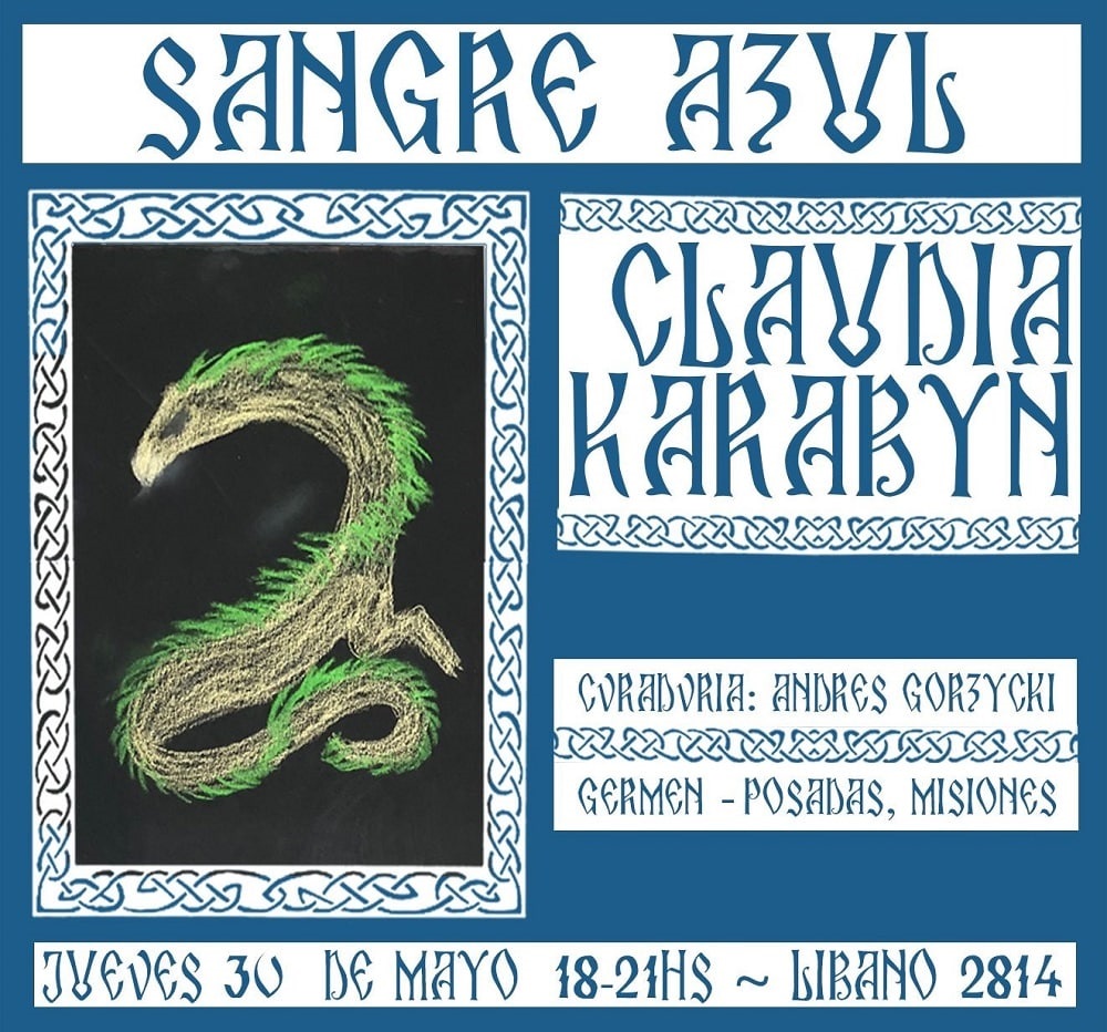 En una nueva propuesta de proyecto Germen, el próximo jueves 30 de mayo de 18 a 21 horas, se inaugura la muestra “Sangre Azul”, de Claudia Karabyn con curaduría de Andrés Gorzycki, en el espacio-taller, ubicado en Pedro Méndez 2814 de Posadas. La misma contará con una serie de dibujos y pinturas que exploran paisajes imaginarios, seres mitológicos y símbolos secretos. La entrada será libre y gratuita.