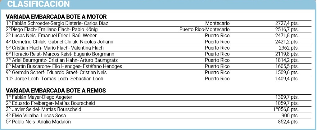 Entre los sacrificados remeros, también fue categórico el triunfo de Fabián Mayer y Diego Aegeter, que finalizaron con nueve especies y tres cupos. La dupla también se consagró en la pesca de la boga, con la captura de seis ejemplares. El otro equipo que fiscalizó la especie fue el integrado por Javier Seidel y Walter Bourscheid, con solo un ejemplar.