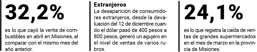 En este sentido, se conocieron dos indicadores que demuestran el fuerte retroceso que vive la economía y que impacta en los gastos de los misioneros: el consumo de combustible cayó 32,2% en marzo con respecto al mismo mes del año pasado, medido en cantidad de litros vendidos; y el consumo en los supermercados de la provincia se redujo 24,1% en abril.