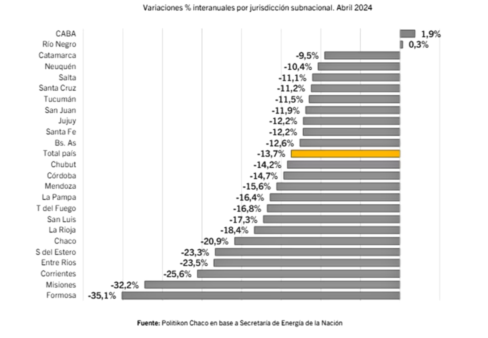 Sobre un total de 25 jurisdicciones (Buenos Aires se desagrega en Gran Buenos y resto de la provincia), todas registraron bajas reales de las ventas correspondientes al mes de marzo 2024. La jurisdicción con la caída más leve fue Santa Fe (-3,2%) al tiempo que Formosa registró la más fuerte (-33,1%).
