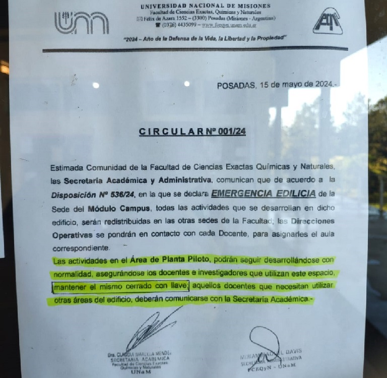 De tal forma, la Facultad de Exactas buscó alternativas para no afectar la seguridad de los estudiantes y docentes mientras no pueda resolverse las reparaciones de este módulo del Campus. Este edificio, fue la última obra que se finalizó en esta parte de la UNaM y se encuentra antes del nuevo predio que comenzó a hacerse, pero que seguirá de momento en estado “neutralizado”, a la espera de financiamiento.