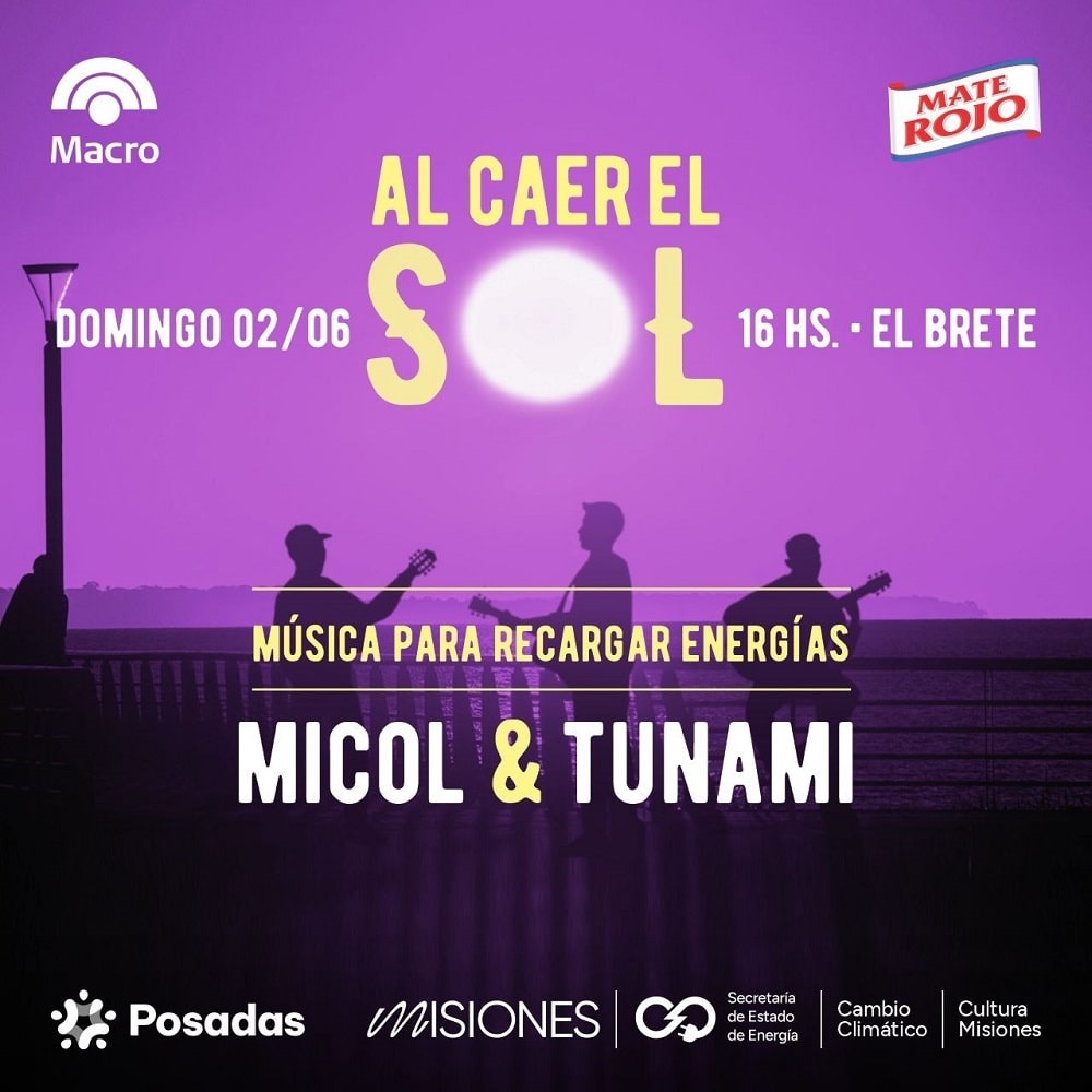 A partir de las 16 en el balneario El Brete de Posadas, llega una nueva edición del ciclo de espectáculos en vivo “Al caer el Sol”. En esta oportunidad actuarán: Micol y Tunami. Entrada libre y gratuita.