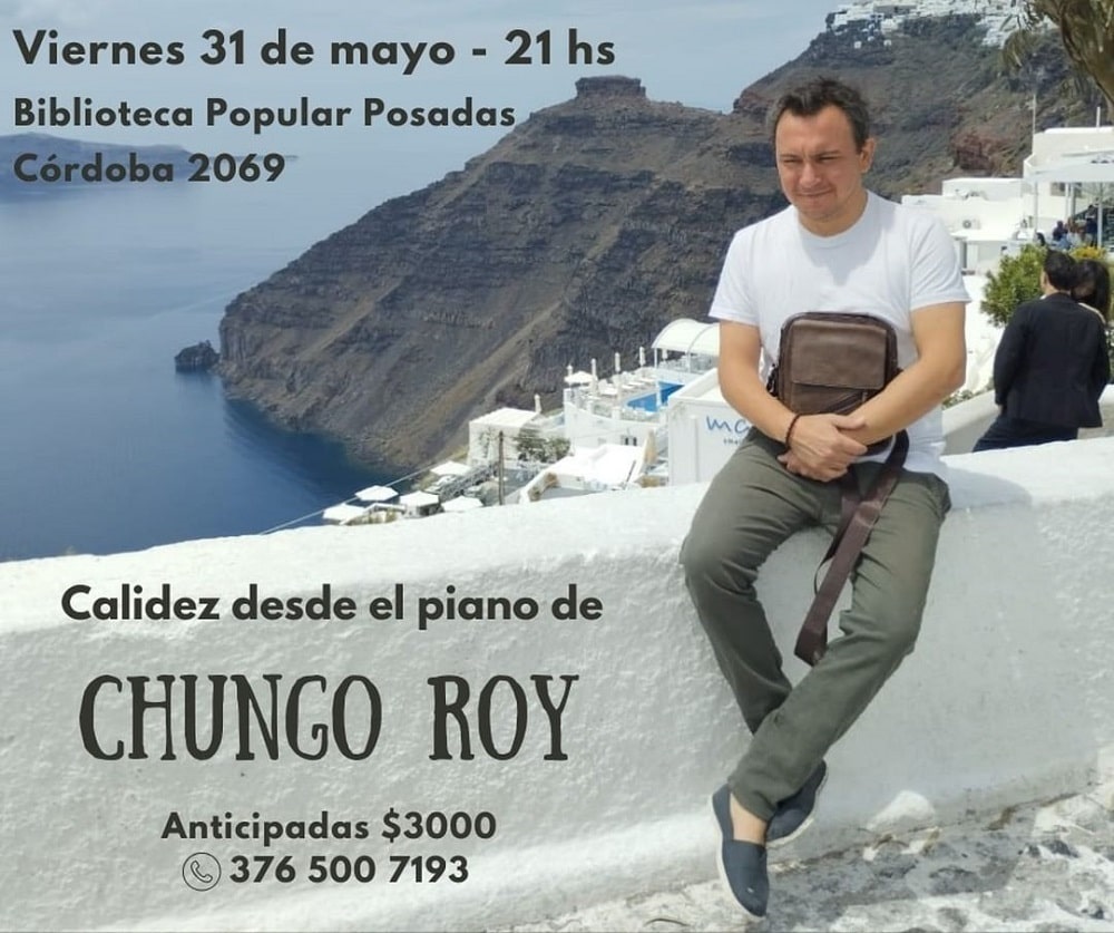 Con la notable calidez de la música del piano, Chungo Roy se presentará este viernes a las 21 horas en la Biblioteca Popular Posadas. Entrada: Anticipada $3.000. Consultas al 376-5007193.