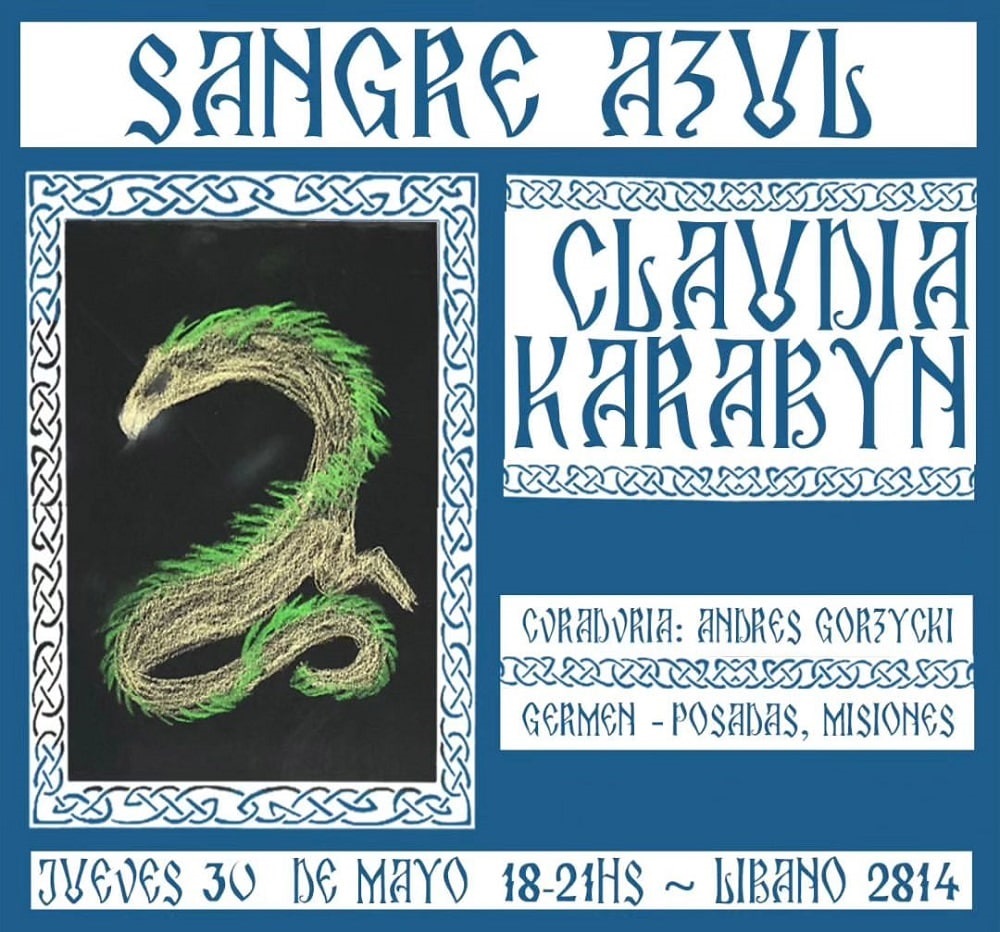 “Sangre Azul” es la nueva exposición individual de Claudia Karabyn, con curaduría de Andrés Gorzycki, se presentará este jueves 30 de 18 a 21 en Líbano 2814 de Posadas. Entrada libre y gratuita.