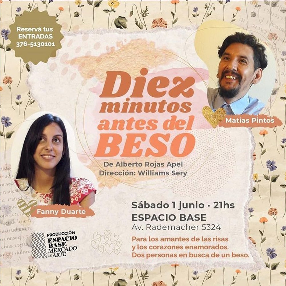 Este sábado a las 21, llega la comedia teatral “Diez Minutos antes del beso” en Espacio Base (Rademacher 5324) de Posadas. Entradas general $3.000. Promo 2 x $5.000 – Reservas al WhatsApp 376-5130101.