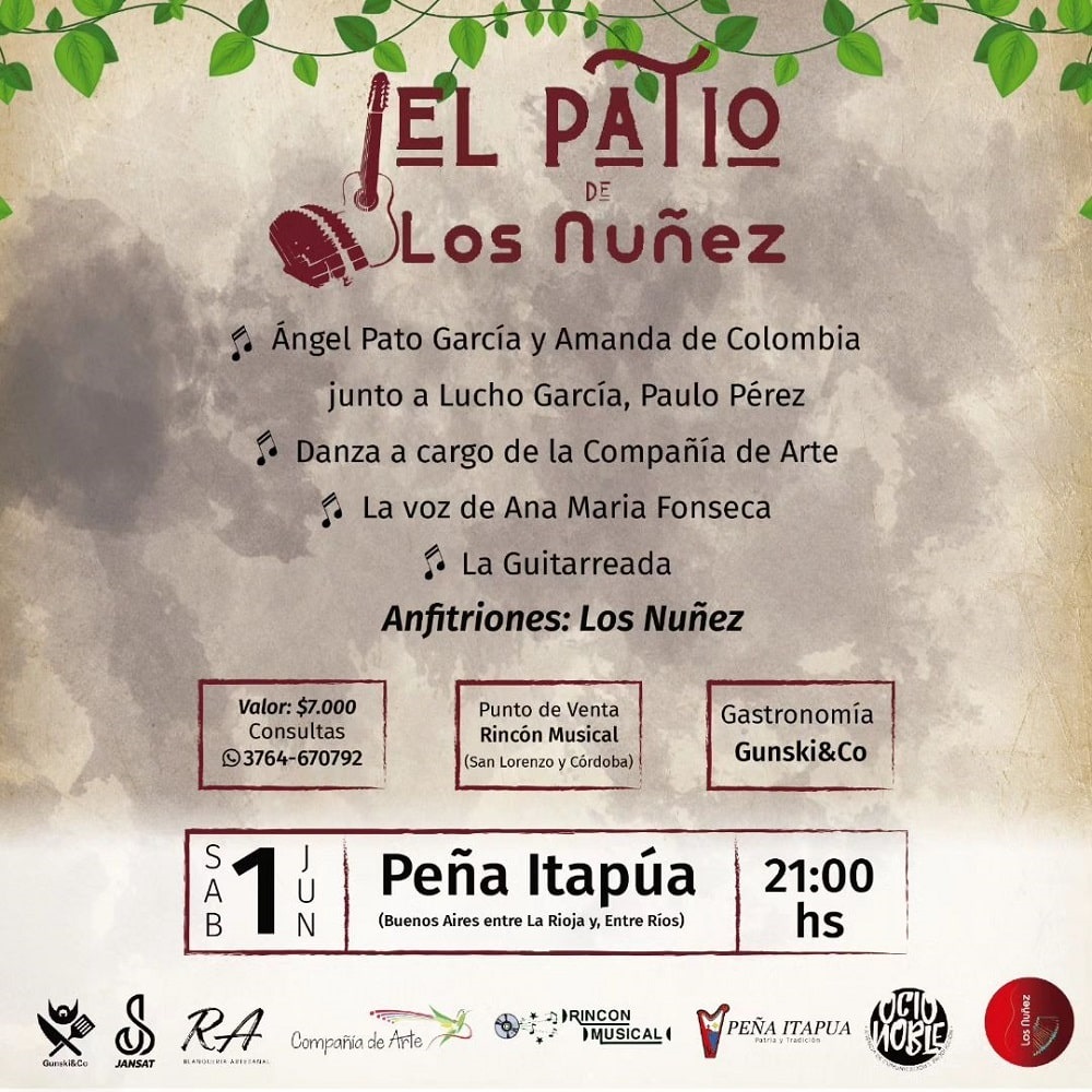 En una noche llena de música, El Patio de los Núñez, presenta este sábado a partir de las 21 horas, al Pato García y Amanda de Colombia junto a Lucho García y Paulo Pérez en la Peña Itapúa de Posadas. También actuarán el grupo de danzas Compañía de Arte, Ana María Fonseca y La Guitarreada. Entradas en venta $7.000 – En venta en Rincón Musical – Con servicio de cantina. Consultas al 376-4670792.