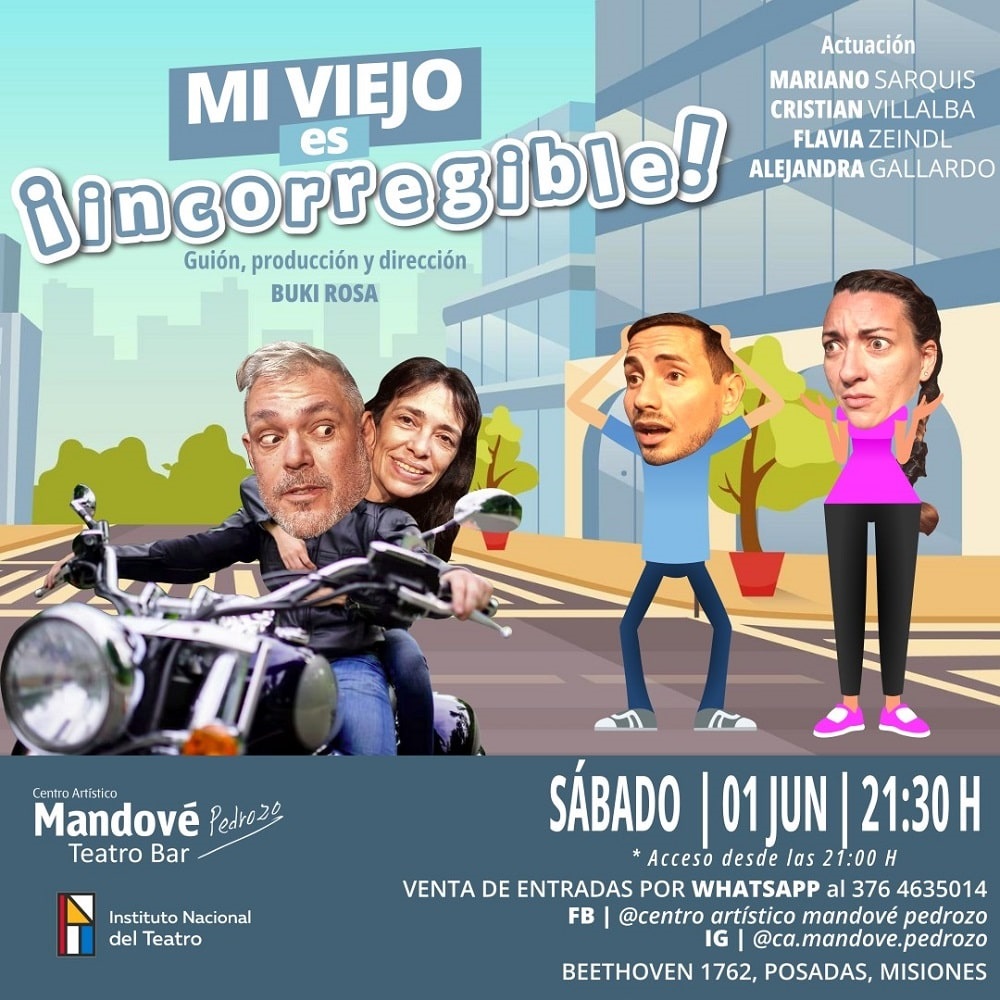 La cartelera del Mandové vuelve a presentar este sábado a las 21,30 la obra teatral ¡Mi viejo es incorregible!. Entrada general $3.000. Anticipadas hasta el viernes a $2.500. Información, ventas y reservas al: 376-4635014.