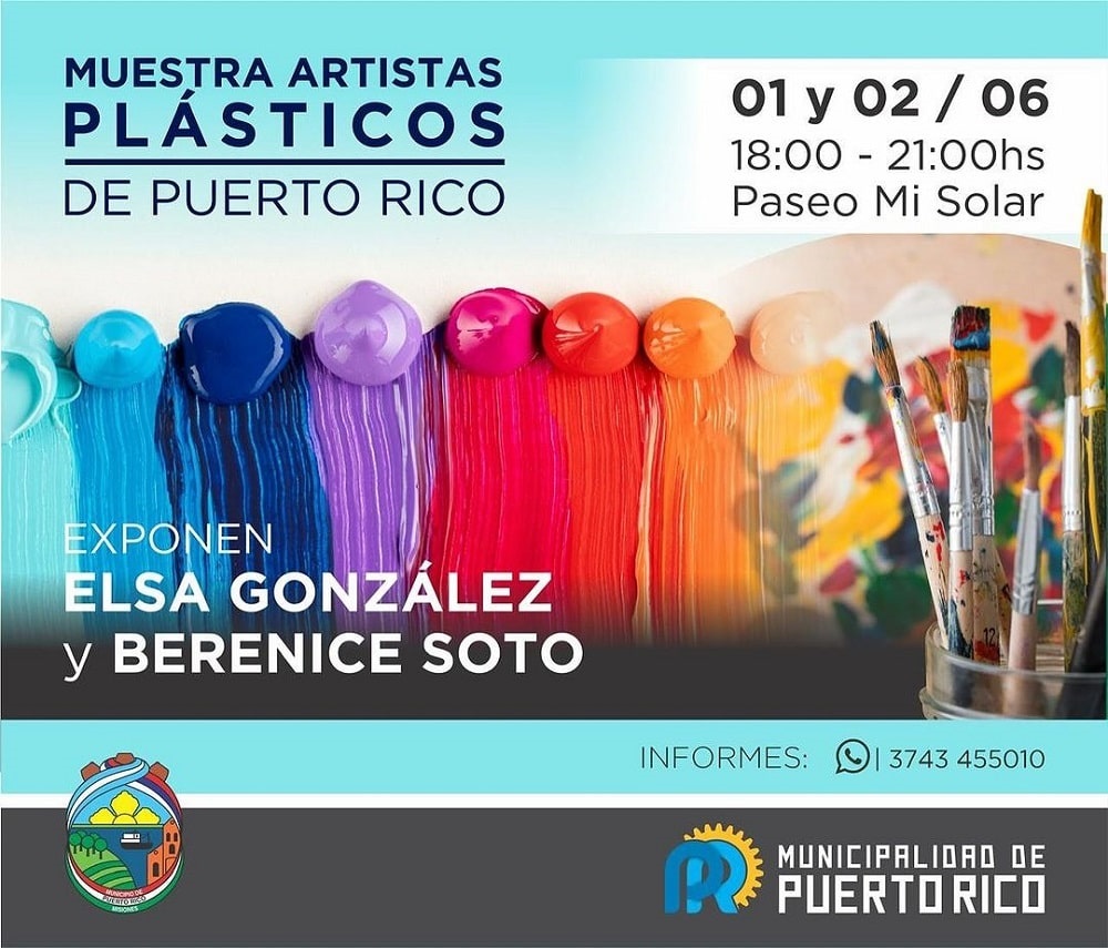 Llega la segunda muestra de artistas plásticos de Puerto Rico, este sábado 1 y domingo 2 de junio, de 18 a 21 horas expondrán: Elsa González y Berenice Soro, en el Paseo Mi Solar. Acceso libre. Consultas al 3743-455010.