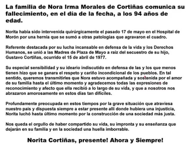 Nacida en 1930, Cortiñas deja un legado de lucha inclaudicable por la memoria, los Derechos Humanos y la justicia social. Cofundadora de Madres de Plaza de Mayo y figura icónica de la Línea Fundadora, una de las dos vertientes en las que se dividió ese organismo, consagró su vida a la búsqueda de su hijo Gustavo Cortiñas, desaparecido el 15 de abril de 1977 por la última dictadura cívico militar, y de todos los hijos que fueron víctimas de secuestros ilegales, torturas y desapariciones forzadas, entre otros crímenes de lesa humanidad.