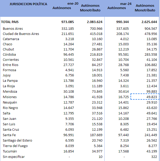 Solo en los primeros tres meses de 2024, en Misiones se produjo un incremento de casi mil nuevos monotributistas, pasando de 49.072 en enero al número de 49.823 en marzo.