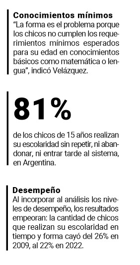 Sin embargo, al incorporar al índice los niveles de desempeño (medidos por PISA), los resultados empeoran: la cantidad de chicos que realizan su escolaridad en tiempo y forma cayó de 26 de cada 100 en 2009, a 23 de cada 100 en 2012 y 2018, a 22 de cada 100 en 2022.