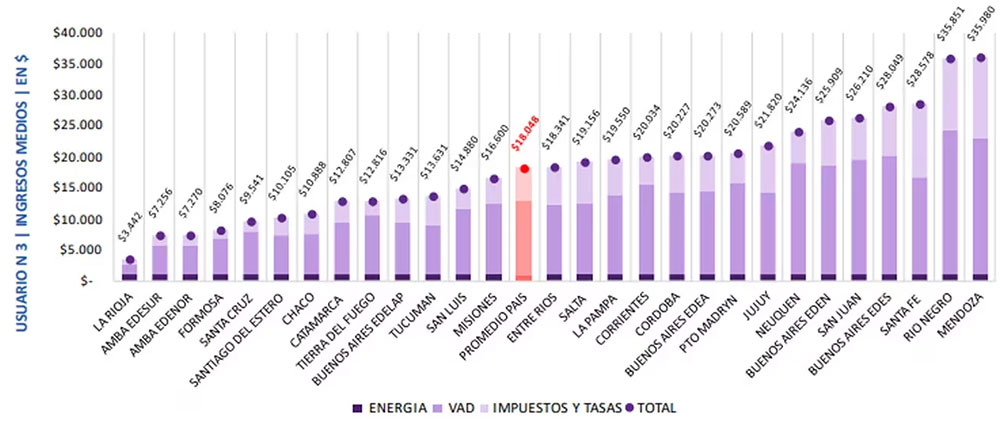 De acuerdo con el trabajo, las tarifas finales más bajas se encuentran en La Rioja, Tierra del Fuego y el AMBA para los hogares de mayores ingresos (N1). La misma situación se repite los agrupados en niveles bajos (N2) y medios (N3), aunque en esos casos la provincia patagónica queda por fuera del podio.