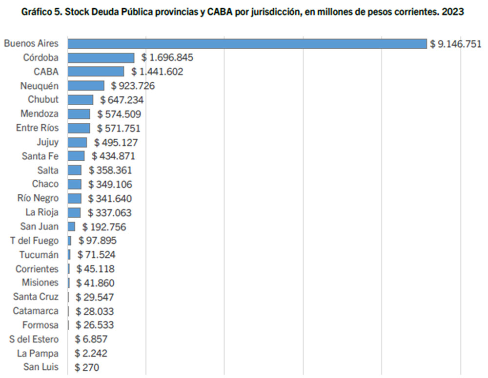Entre las 24 jurisdicciones subnacionales, los mayores stocks de deuda pública en pesos corrientes se observan en la provincia de Buenos Aires ($9.146.751 millones equivalente al 51,2% del consolidado de las jurisdicciones), la provincia de Córdoba ($1.696.845 millones y el 9,5% de participación) y CABA ($1.441.602 millones y concentrando el 8,1%).
