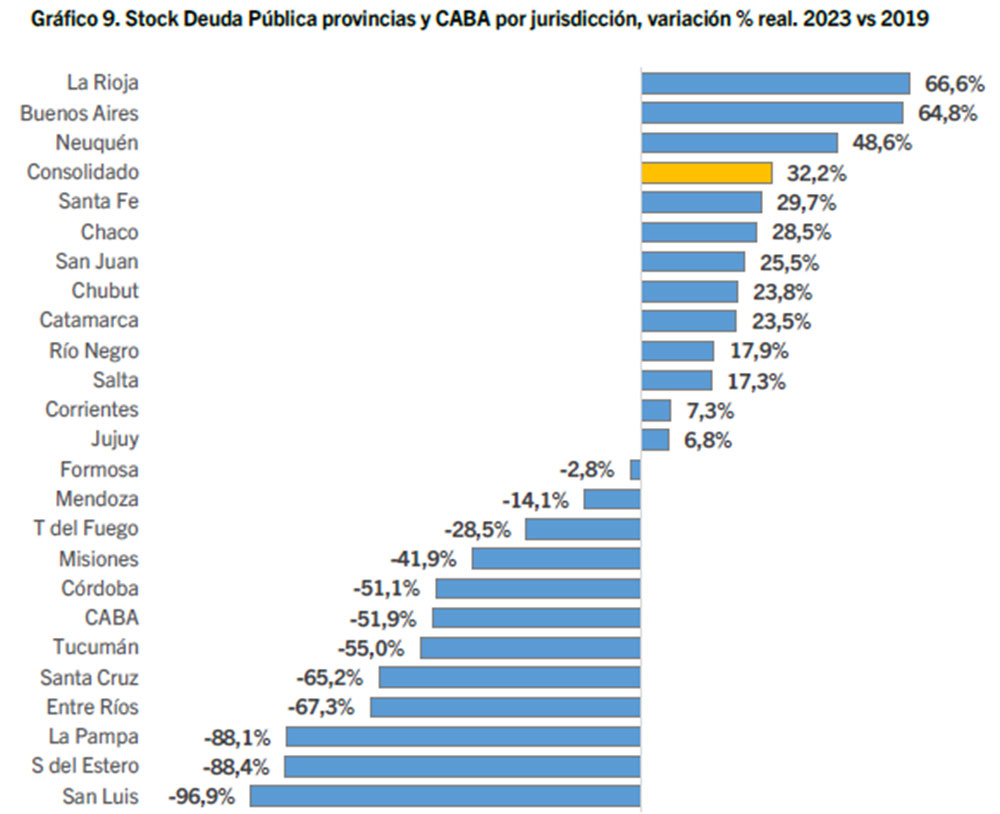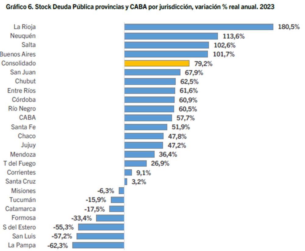 Los mayores incrementos se observan en las provincias de La Rioja (+180,5%), Neuquén (+113,5%) y Salta (+102,6%), con el denominar común entre ellas que tienen alta exposición a deuda en dólares, situación que explica principalmente el salto.
