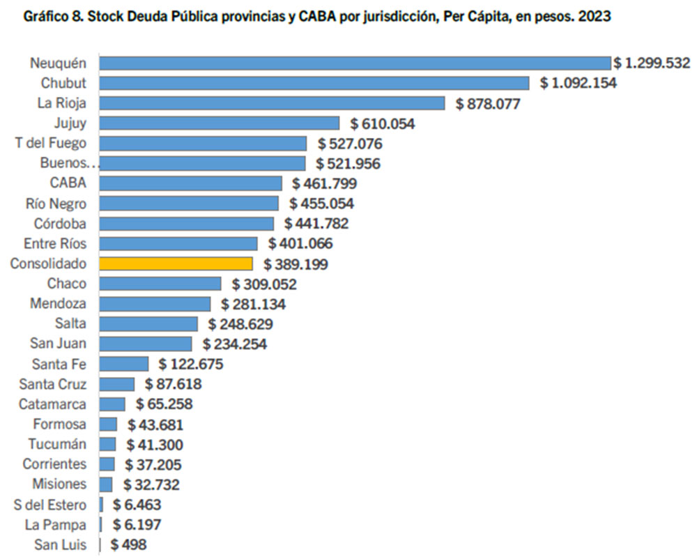 Al medir la deuda “per cápita” en relación con su población, Neuquén encabeza el ranking con una deuda por habitante de $1.299.532, seguida por Chubut con $1.092.154 por habitante y La Rioja con $878.077 por habitante. Son las que exhiben los mayores niveles de deuda pública per cápita del país.